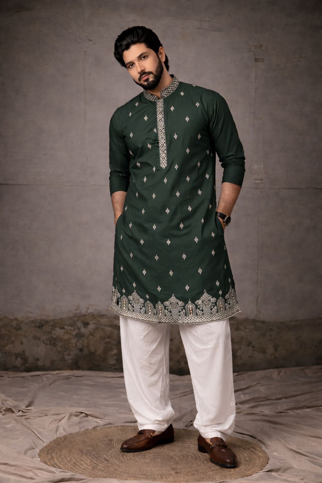Heritage Green Kurta with Delicate All-Over Embroidery