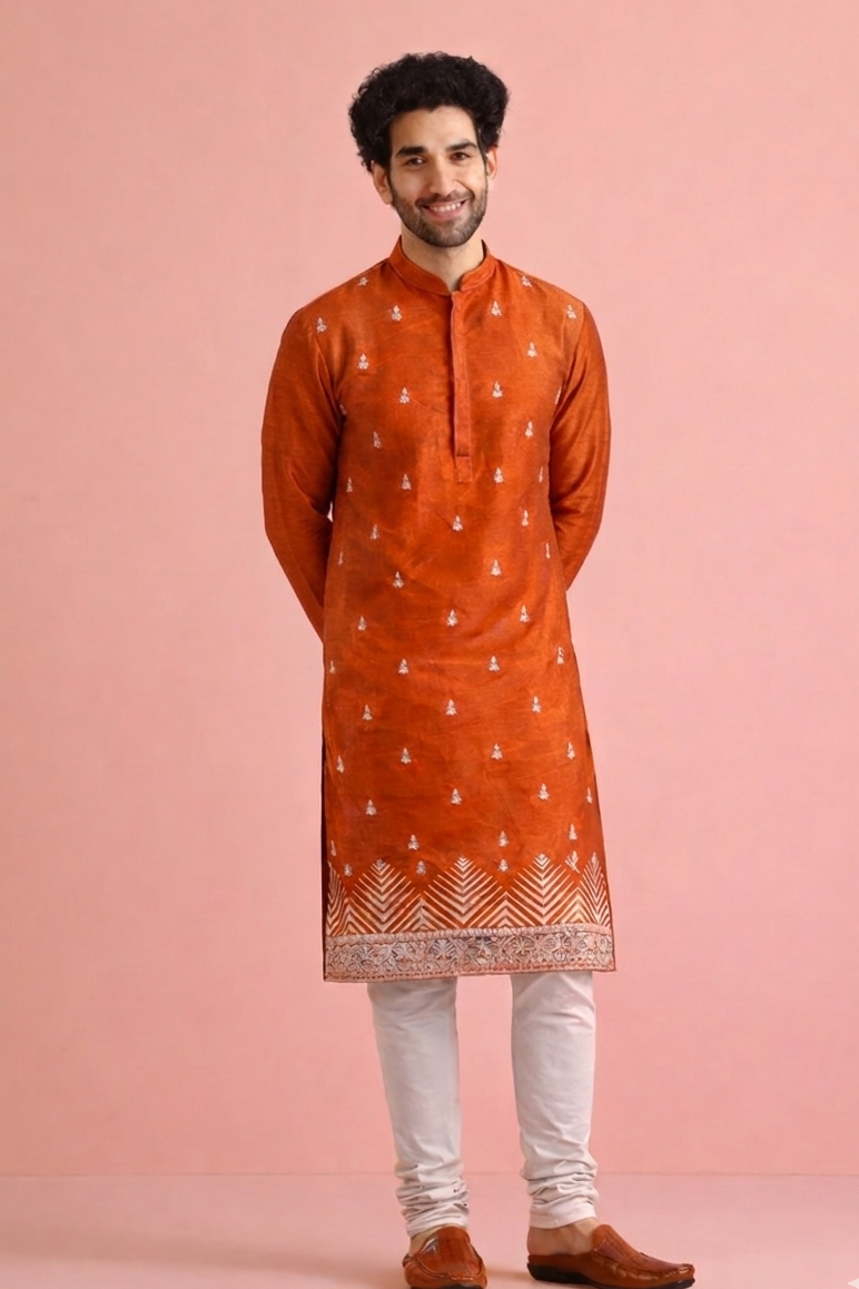 Rustic Orange Velvet Embroidered Kurta with Allover Buta Design