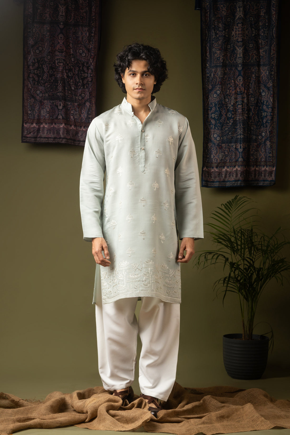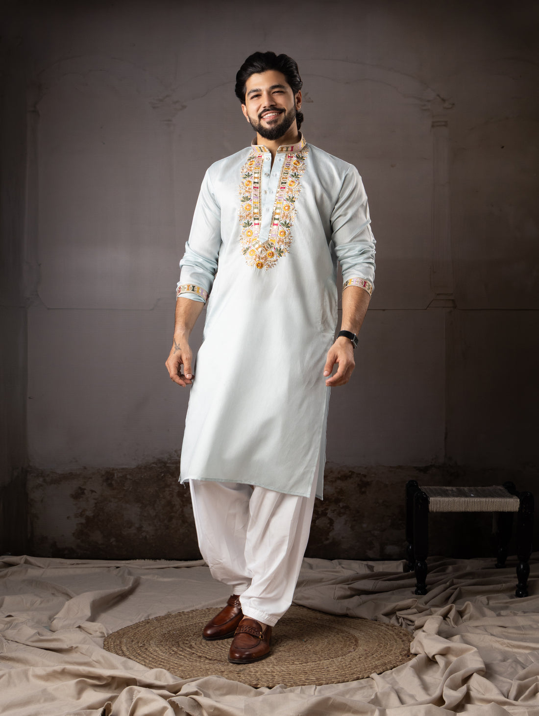 Ice Blue Kurta with Delicate All-Over Embroidery