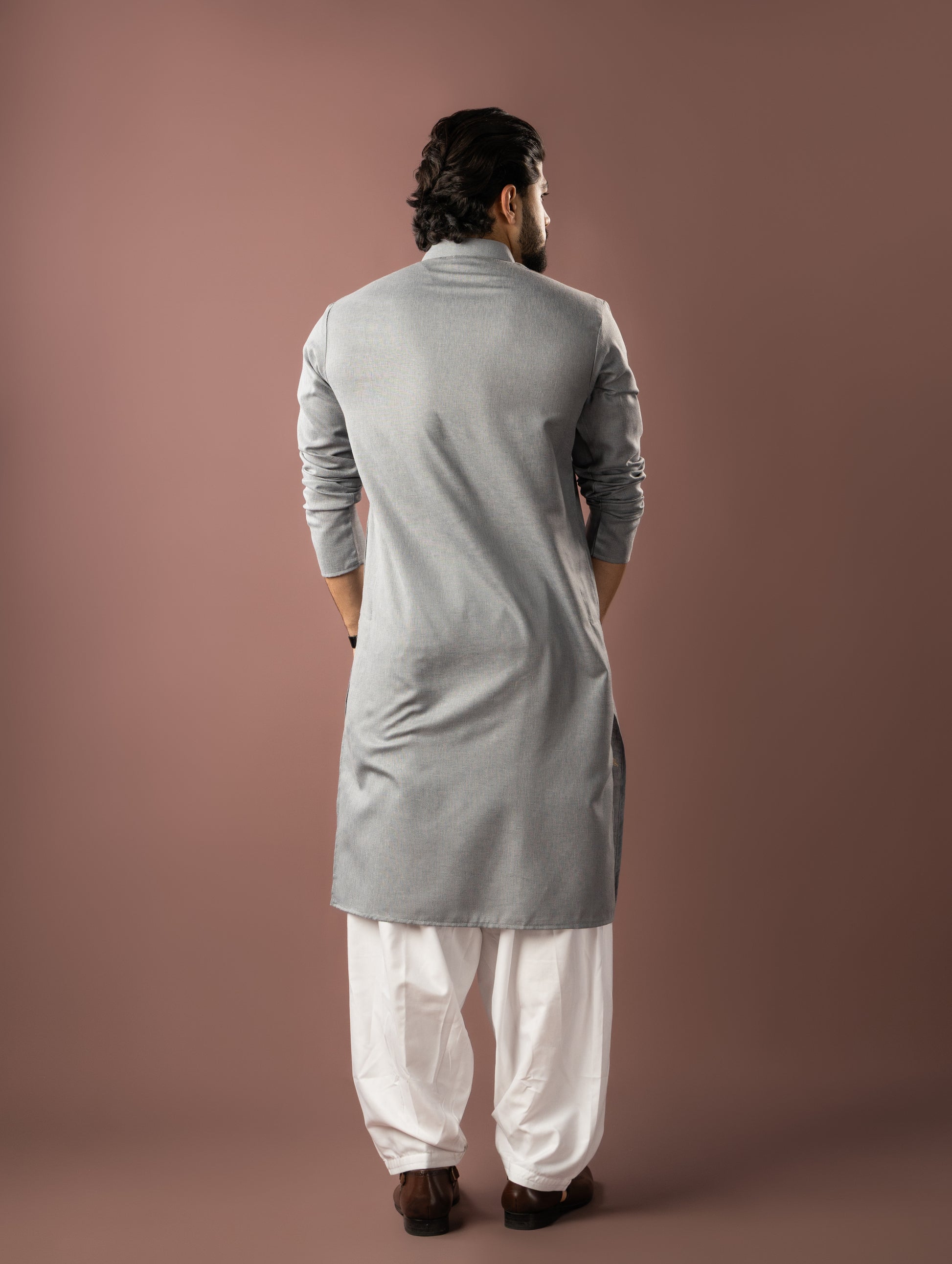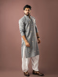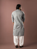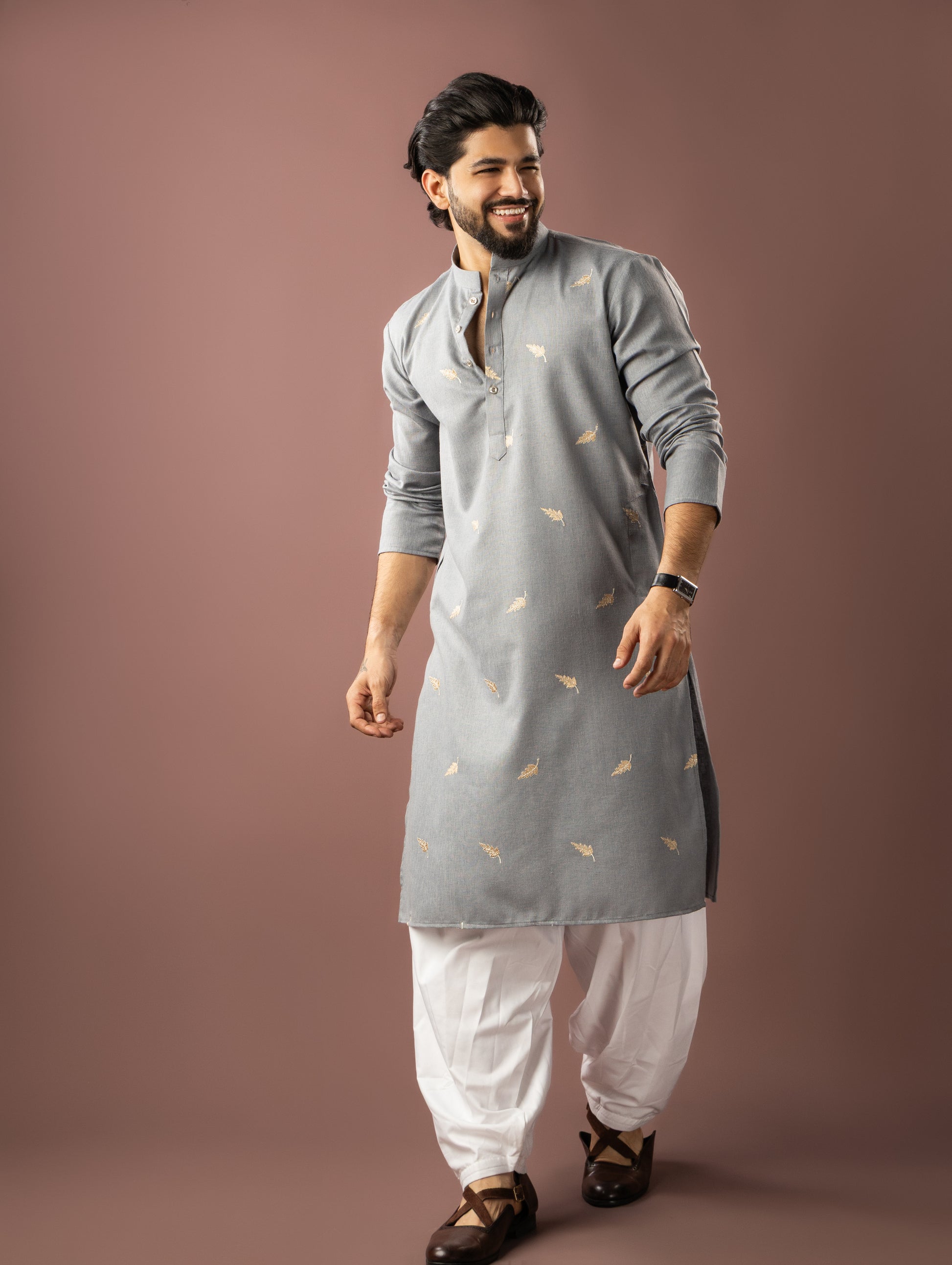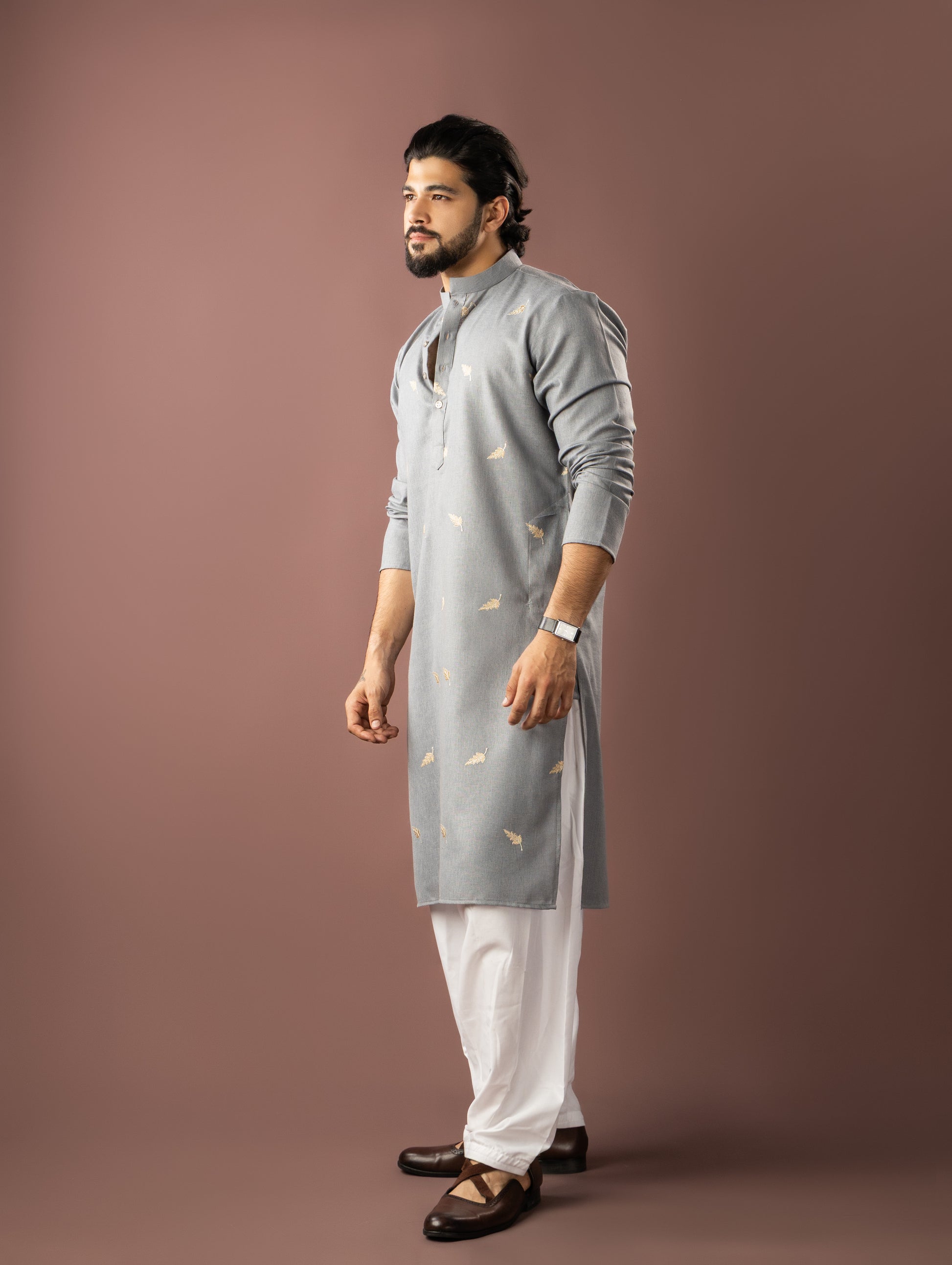 Bluish Grey Leaf Embroidery Motif Linen Kurta