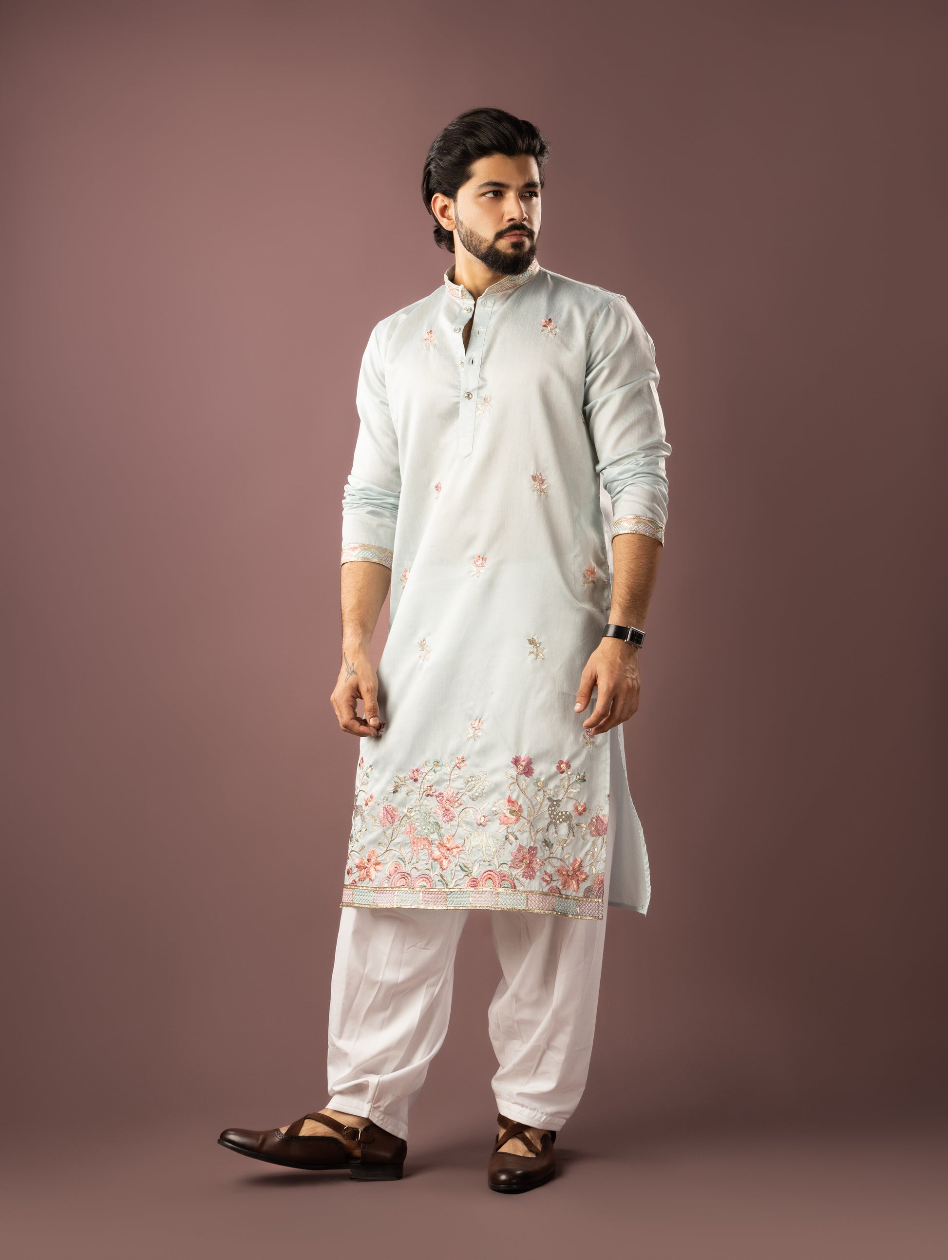 Classic Powder Blue Kurta with Ornate Floral Detailing