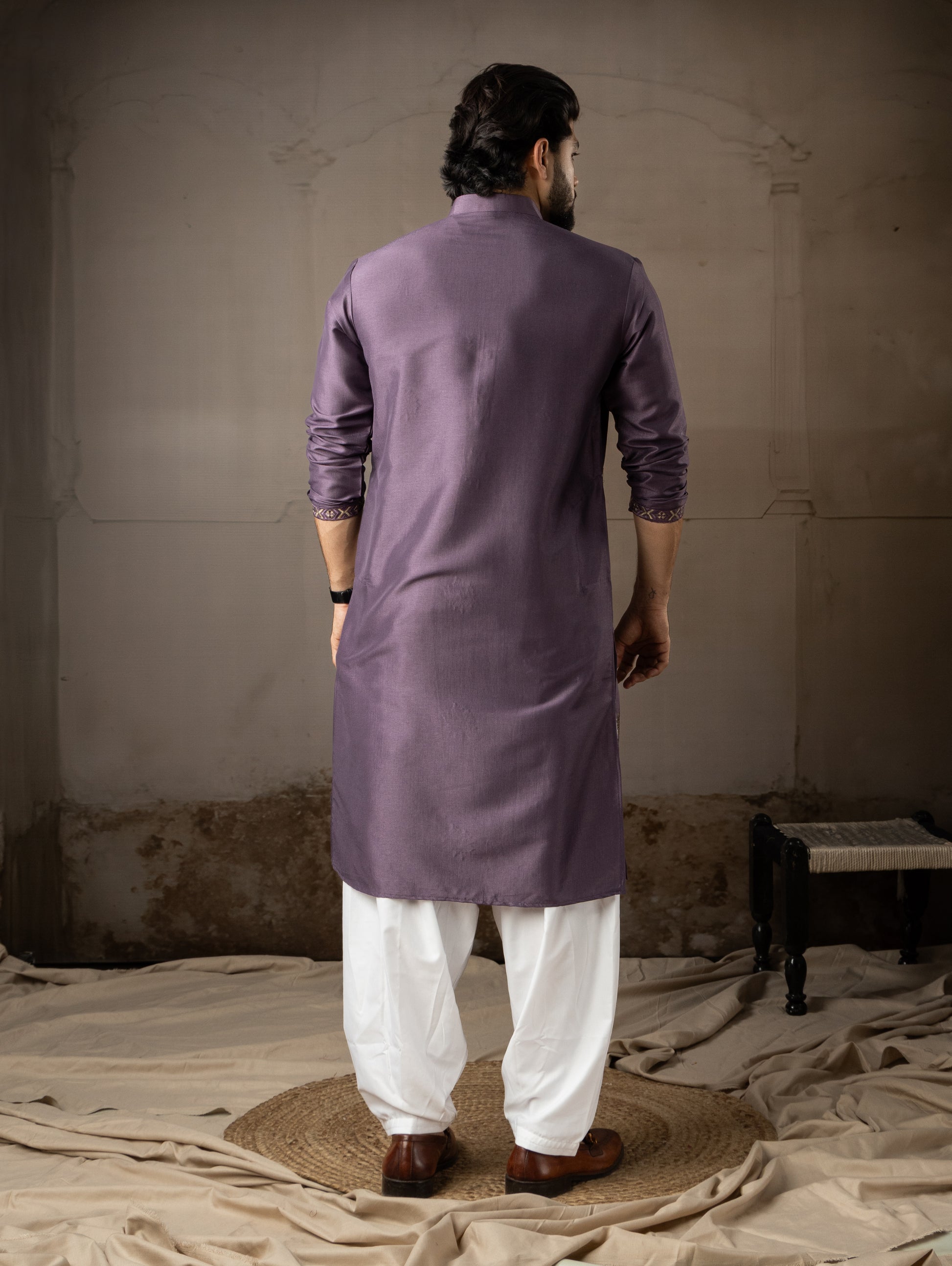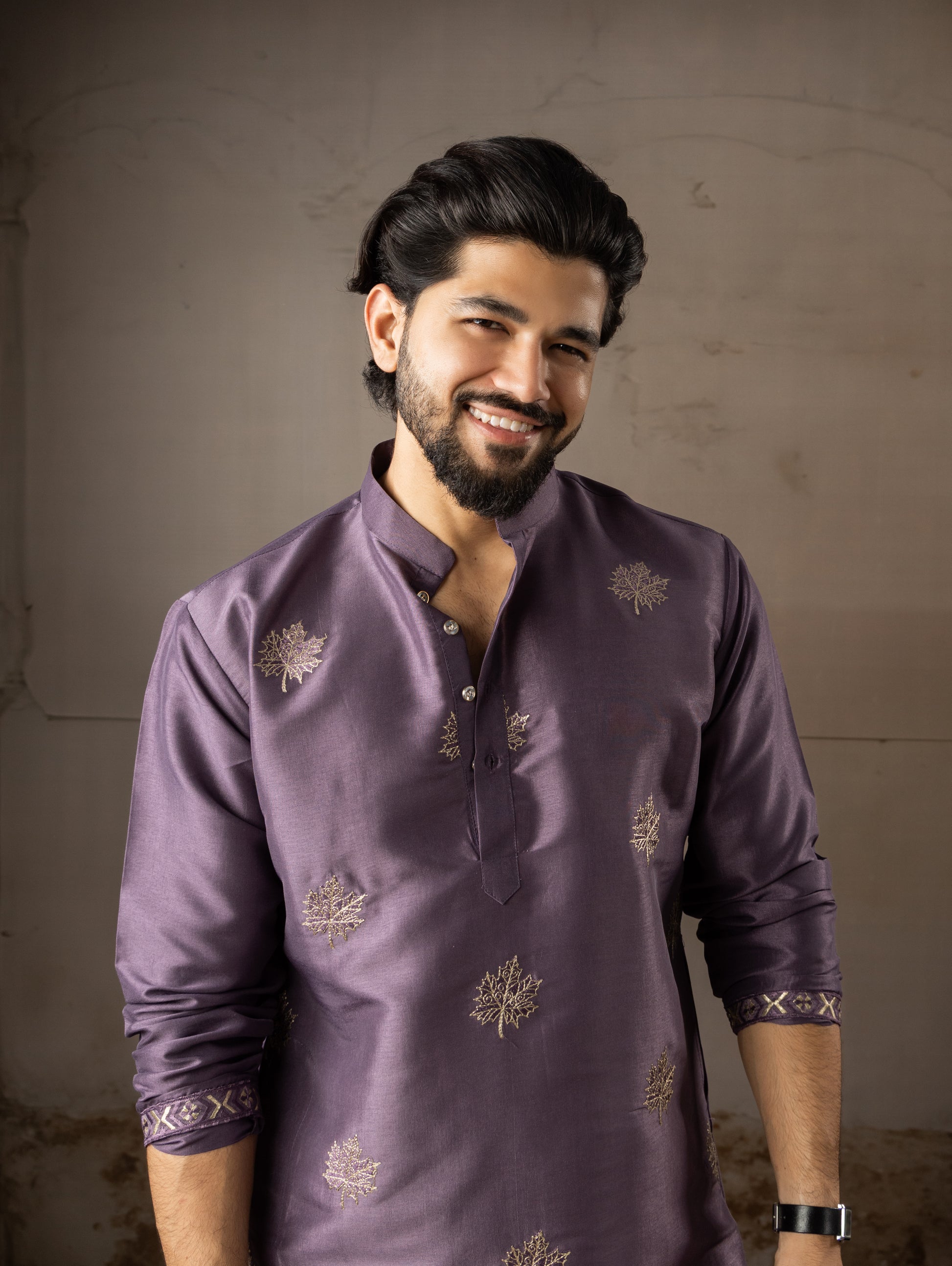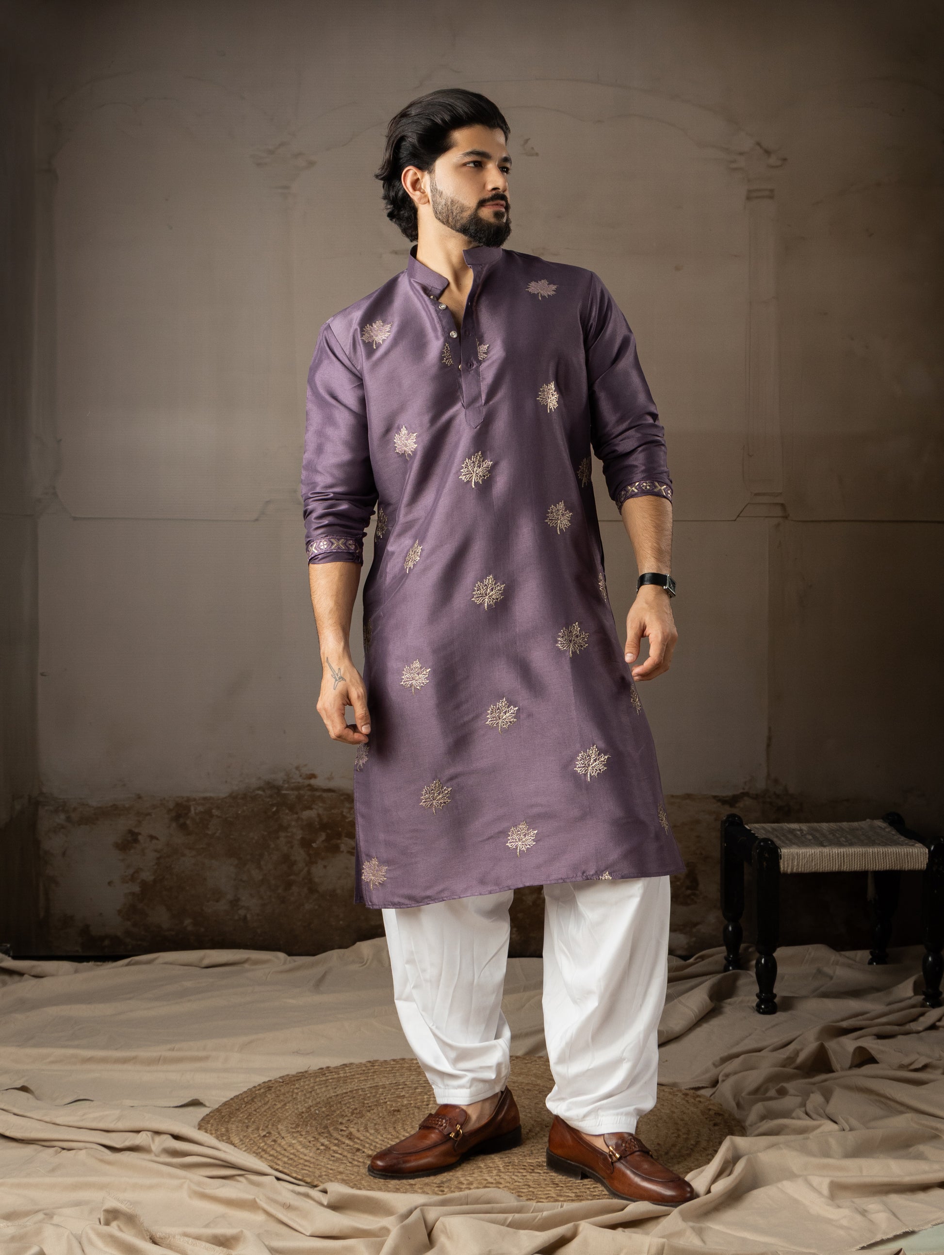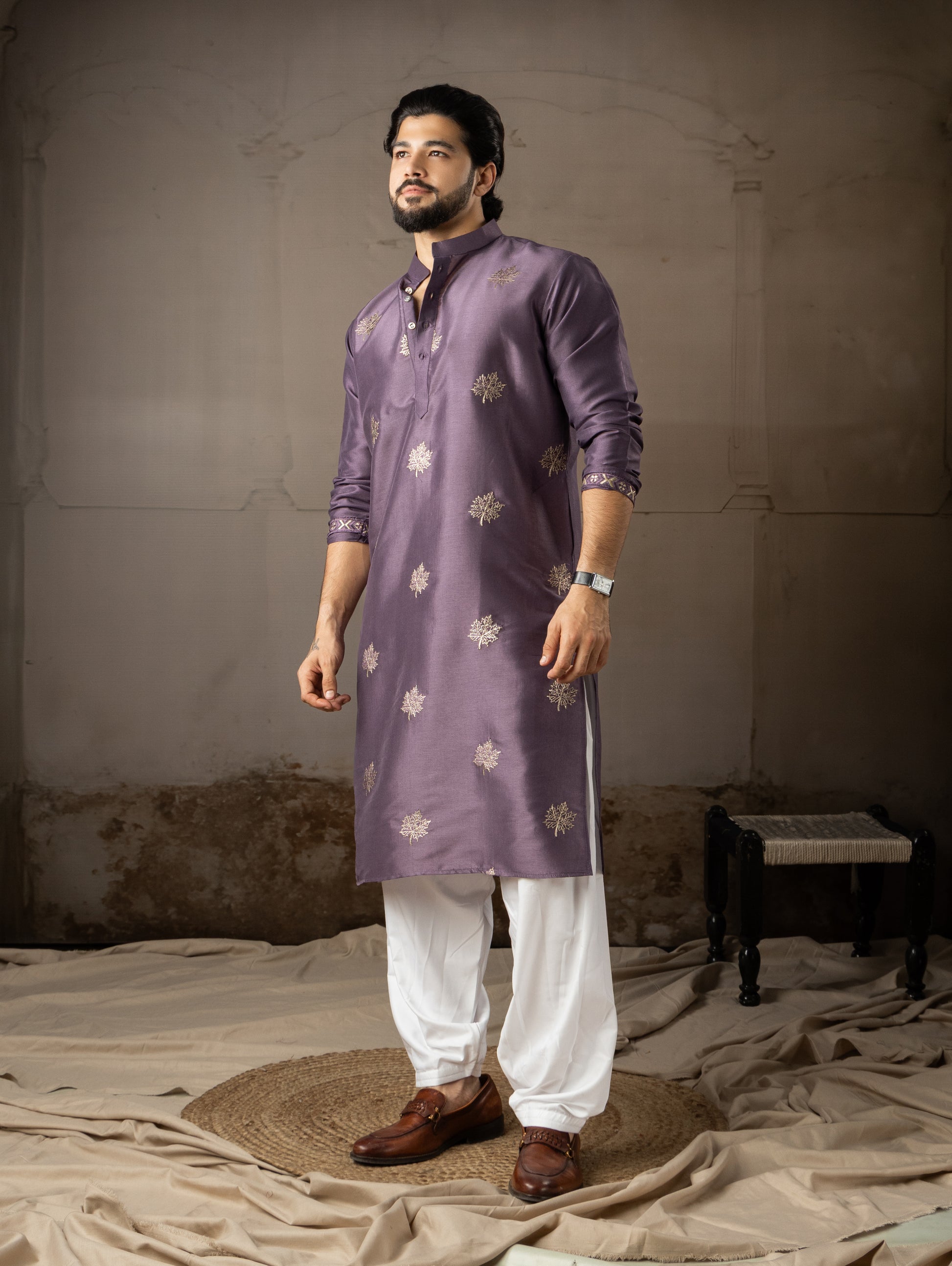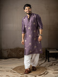 Classic Purple Leaf Embroidered Motif Kurta