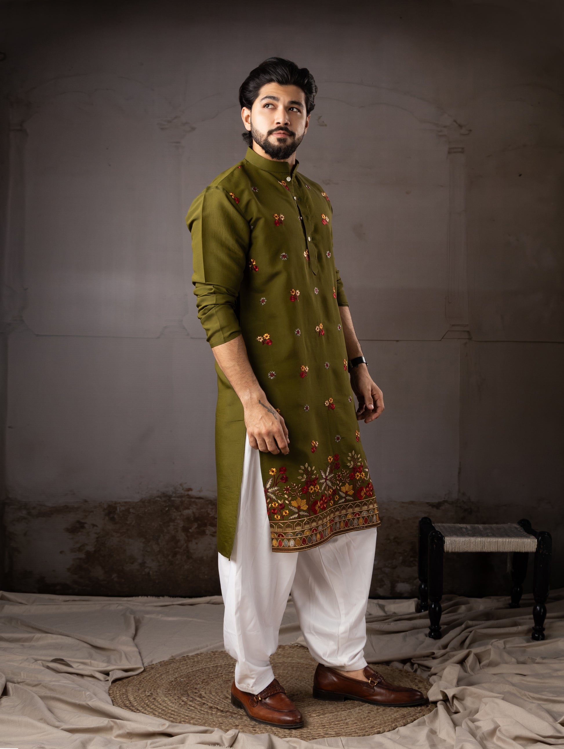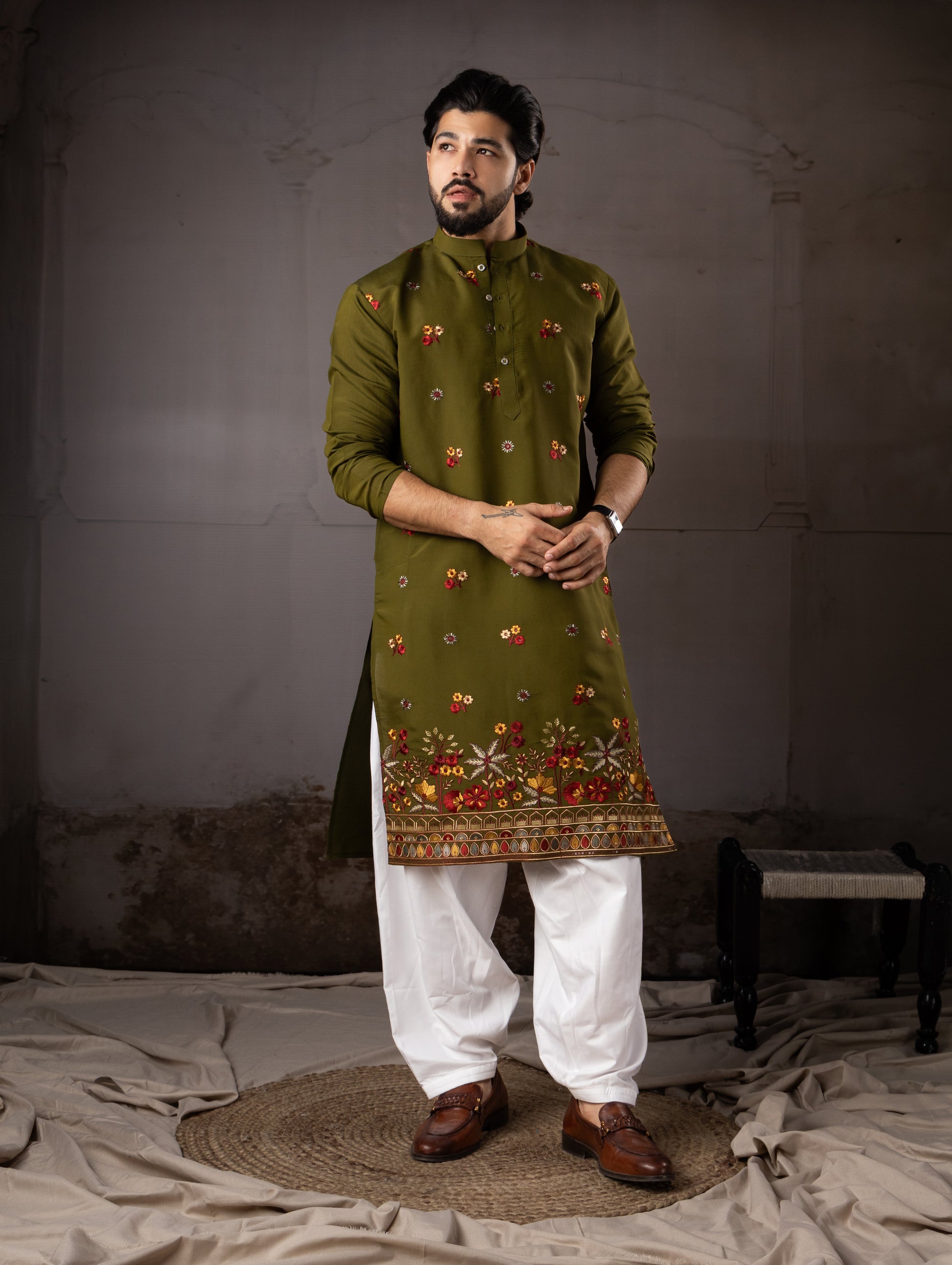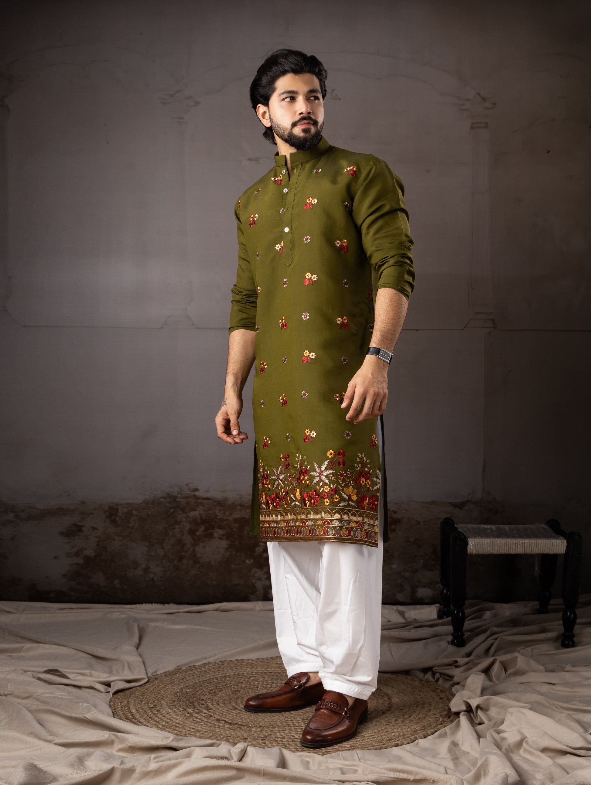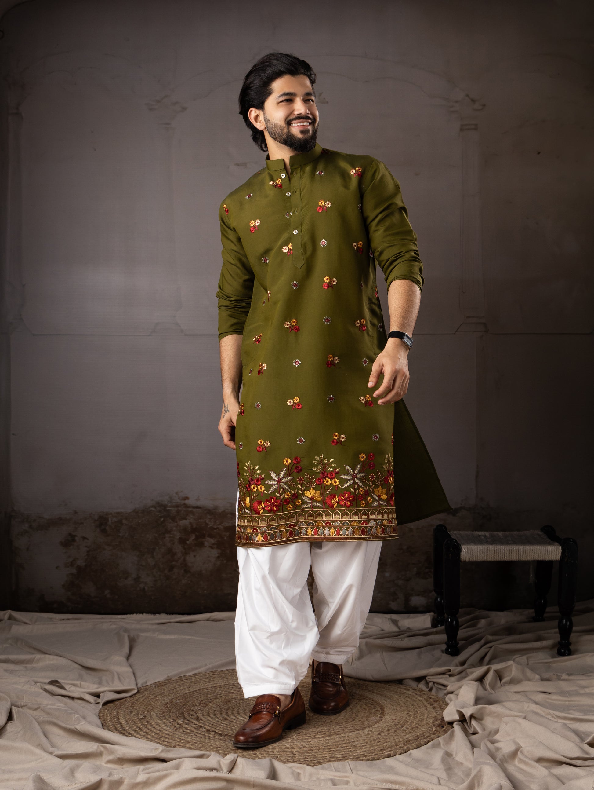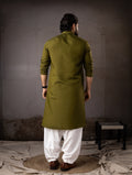 Royal Olive Floral Border Designer Kurta